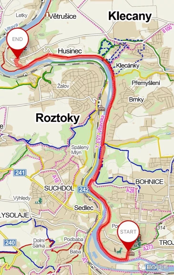 我们将会沿着河边向北徒步11公里约3个小时到Řež,然后坐火车回布拉格(返程火车每半小时一班,可以回到Holešovice或者Masarykovo nádraží,票价40克朗),之后一起去饭店用午餐。沿途树荫不多,请大家准备好足够的饮用水和防晒物品。感谢Grace为我们设计路线,Dennis Ho将是当天的领队。